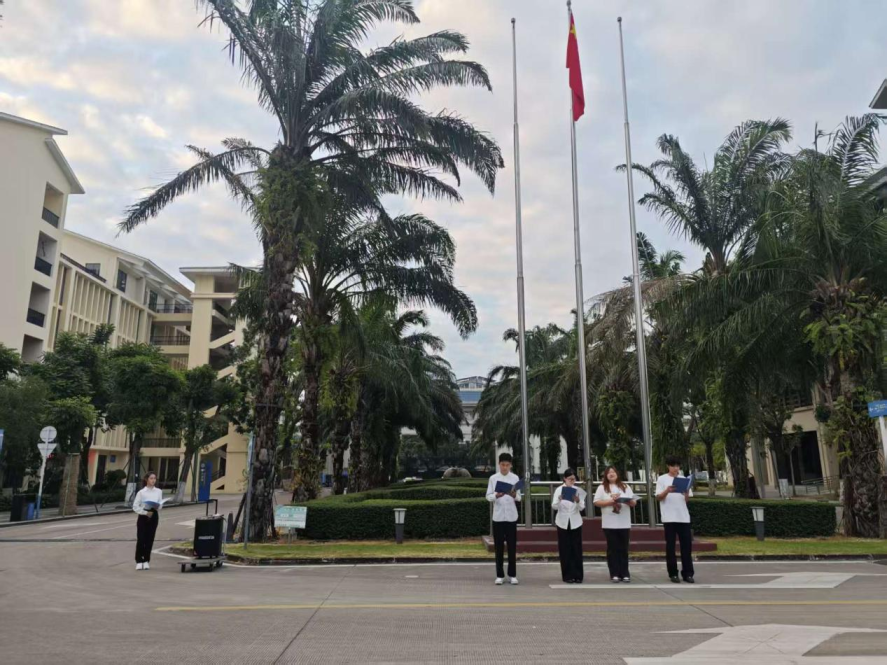 伴随着晨曦微光,国旗护卫队迈着整齐步伐护送国旗入场。在雄壮的国歌声中,五星红旗冉冉升起,全体师生面向国旗庄严宣誓。pg娱乐官网学生代表做国旗下演讲,号召青年学子勇担时代使命,将个人理想融入自贸港建设浪潮。随后,由25级学生代表共同演绎诗朗诵,以激昂文字展现海洋强国建设的壮丽图景。